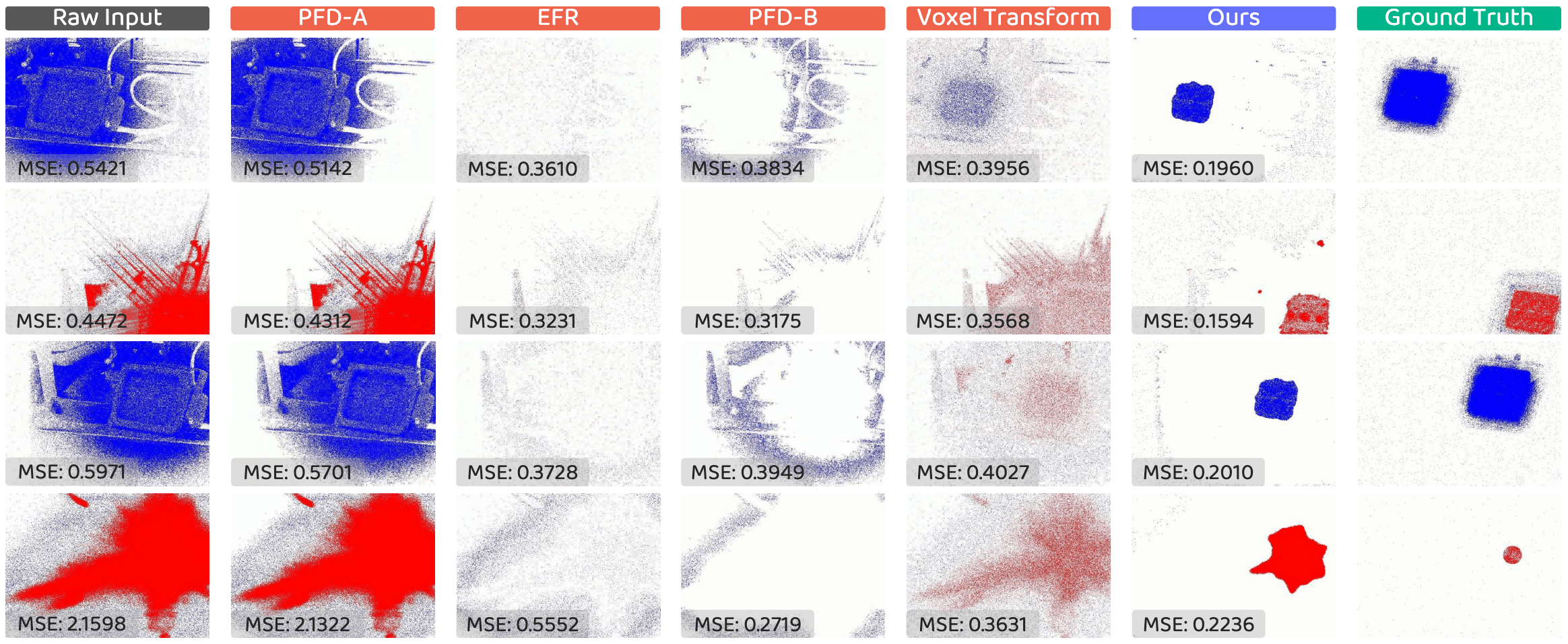 | Method | Chamfer↓ | Gaussian↓ | MSE↓ | PMSE 2↓ | PMSE 4↓ | R-F1↑ | T-F1↑ | TP-F1↑ |