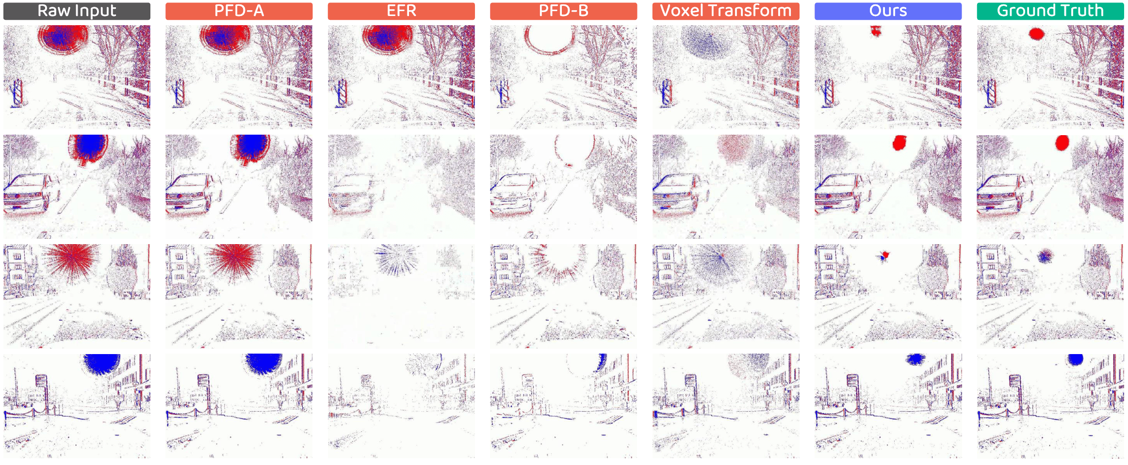 Quantitative comparisons on the E-Flare-2.7K test set. We evaluate against five event-based de-flaring baselines using event-level and voxel-level metrics. ● Raw Input, ● Second-Best, and ● Best results.