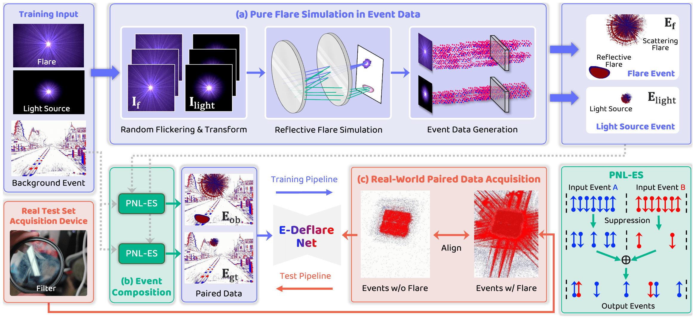 Figure. The pipeline of data generation, training, and validation. In the E-Deflare framework, we introduce two parallel pipelines to address data scarcity. The training pipeline synthesizes paired data by first generating dynamic flare events from static images (e.g., Flare7K++) and then fusing them with real background events (e.g., DSEC) via our physics-guided PNL-ES operator. The testing pipeline captures paired real-world data using a controllable optical setup. A removable filter allows us to record the same dynamic scene with flare and without flare, which forms our validation set after post-processing.