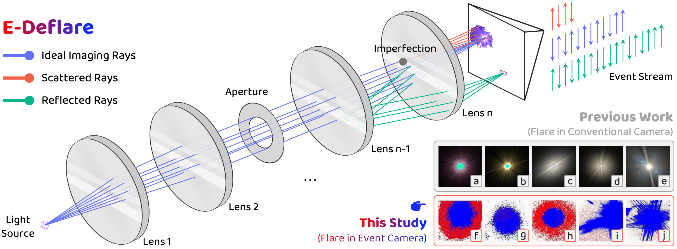 Figure. The physical principle of lens flare and its manifestation in event cameras. The central diagram deconstructs the universal optical process: ideal Imaging Rays form the scene, while Scattered Rays (from lens imperfections) and Internal Reflections superimpose flare artifacts. While lens flare is a well-studied problem in conventional imaging (bottom right, plots a to e), its complex spatio-temporal manifestation in event data has been largely overlooked (bottom right, plots f to j). Our work is the first to systematically address this challenge. The positive (brightness increase) and negative (brightness decrease) events are colored red and blue, respectively.